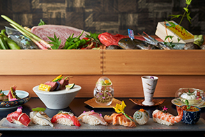緑に囲まれた御殿山庭園を望むモダンなジャパニーズダイニング。シェフの巧みな技が光る料理をお届けします。