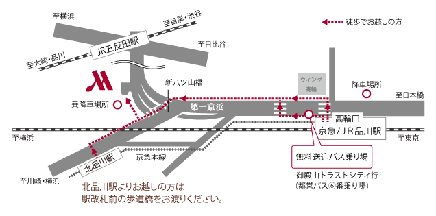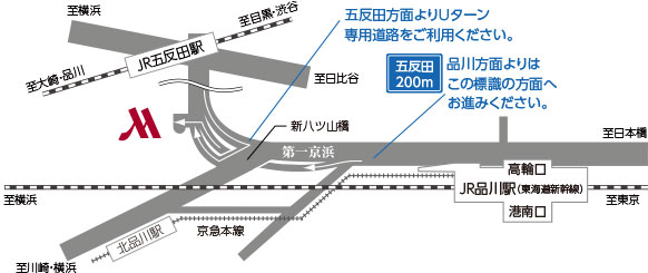 新八ツ山橋交差点手前で五反田方向車線(左車線)に入りトンネルをくぐり、1つ目の信号を左へ第一京浜・大森方面から