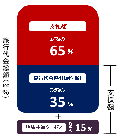 そのうち7割の14,000円は旅行代金割引となり、旅行者の支払額は26,000円となります。残りの3割の6,000円が地域共通クーポンとして付与されます。